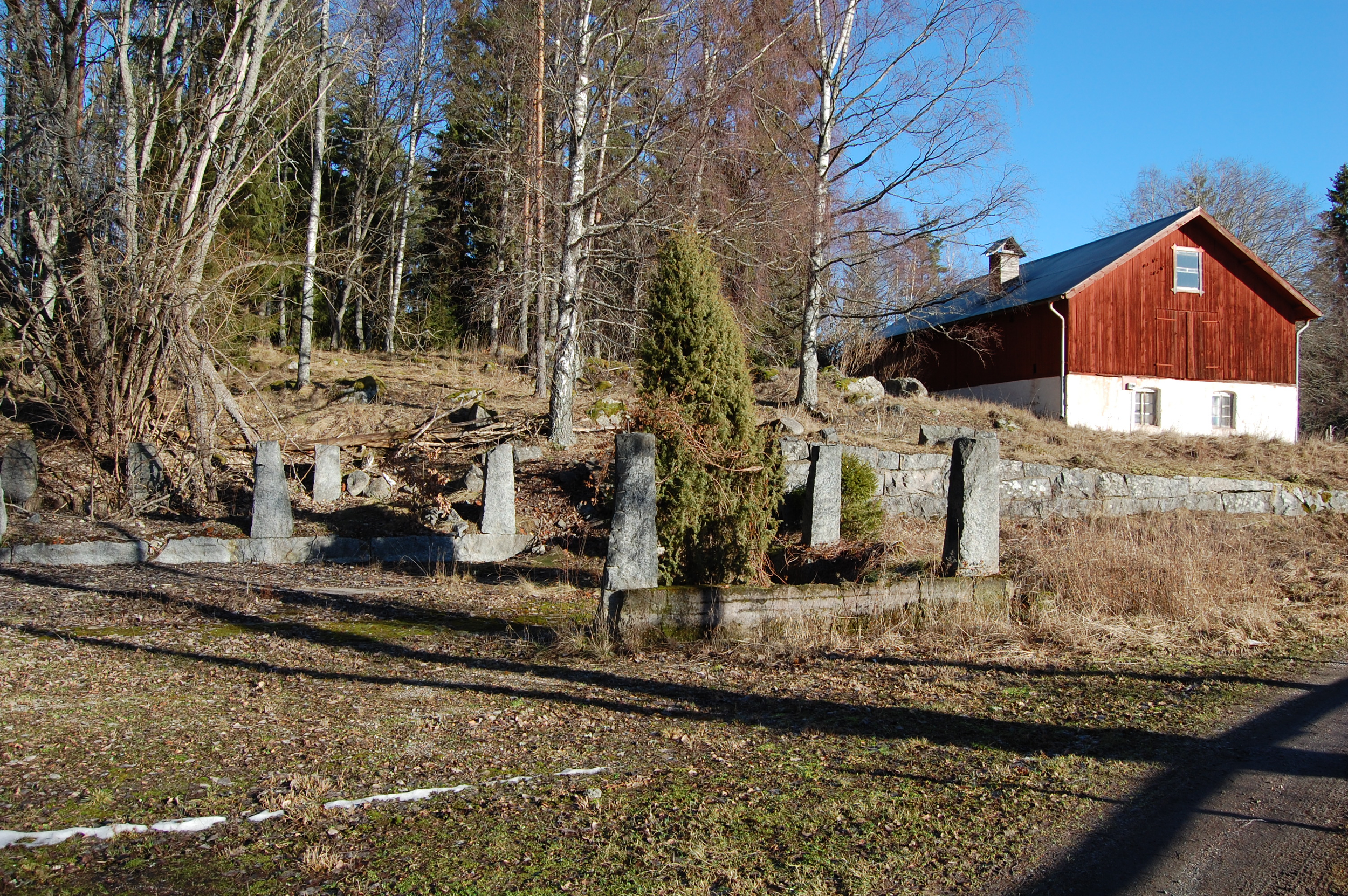 Bebyggelsen lades i skogsbrynet med utsikt över de öppna fälten ner mot Ramsjön.